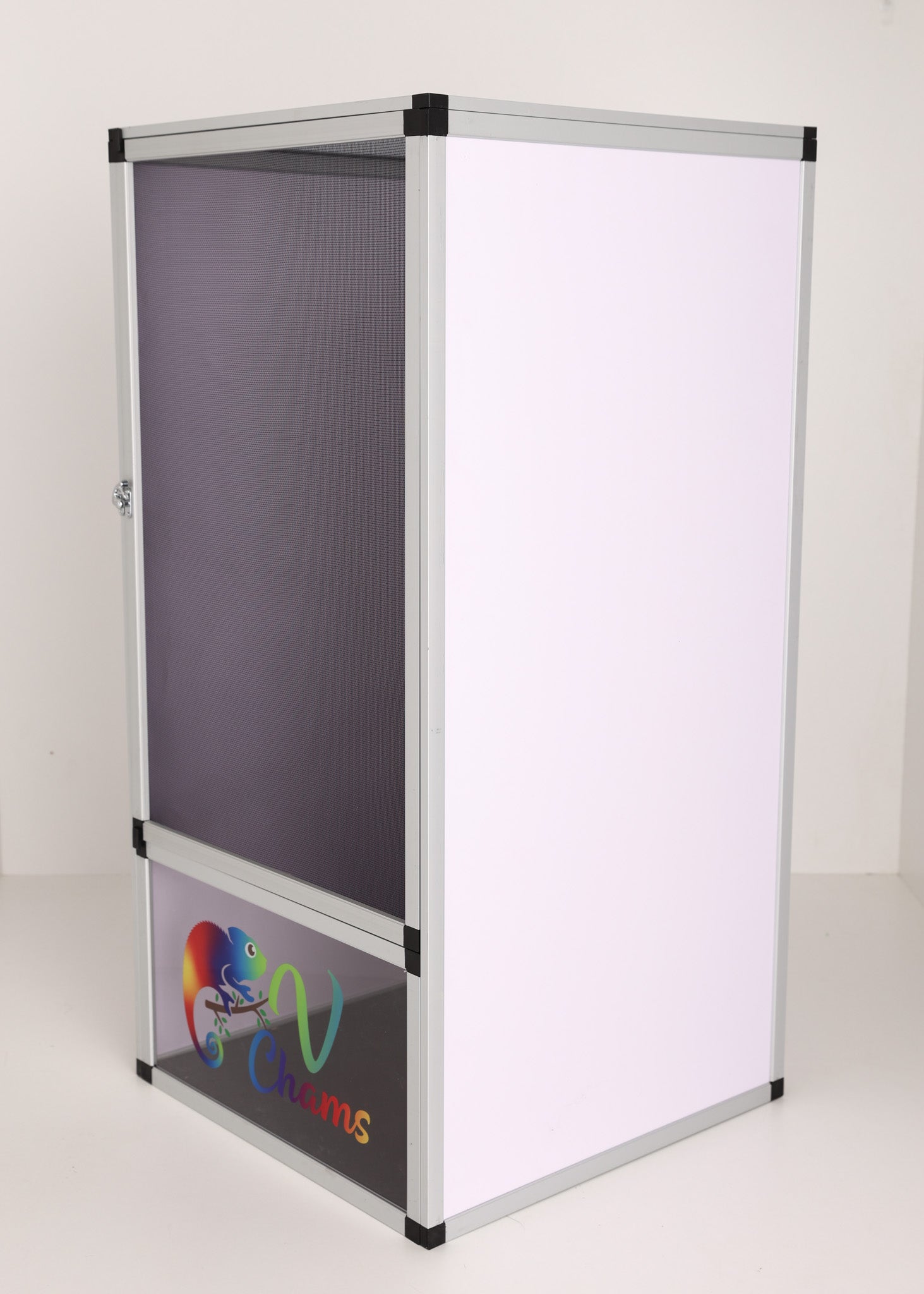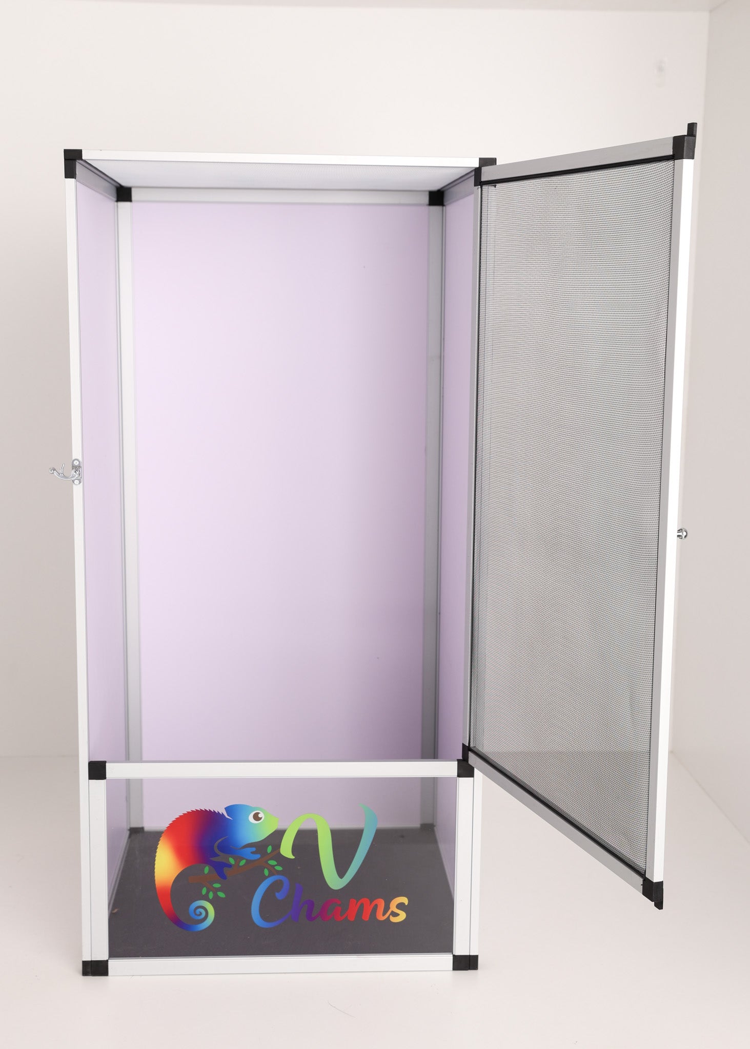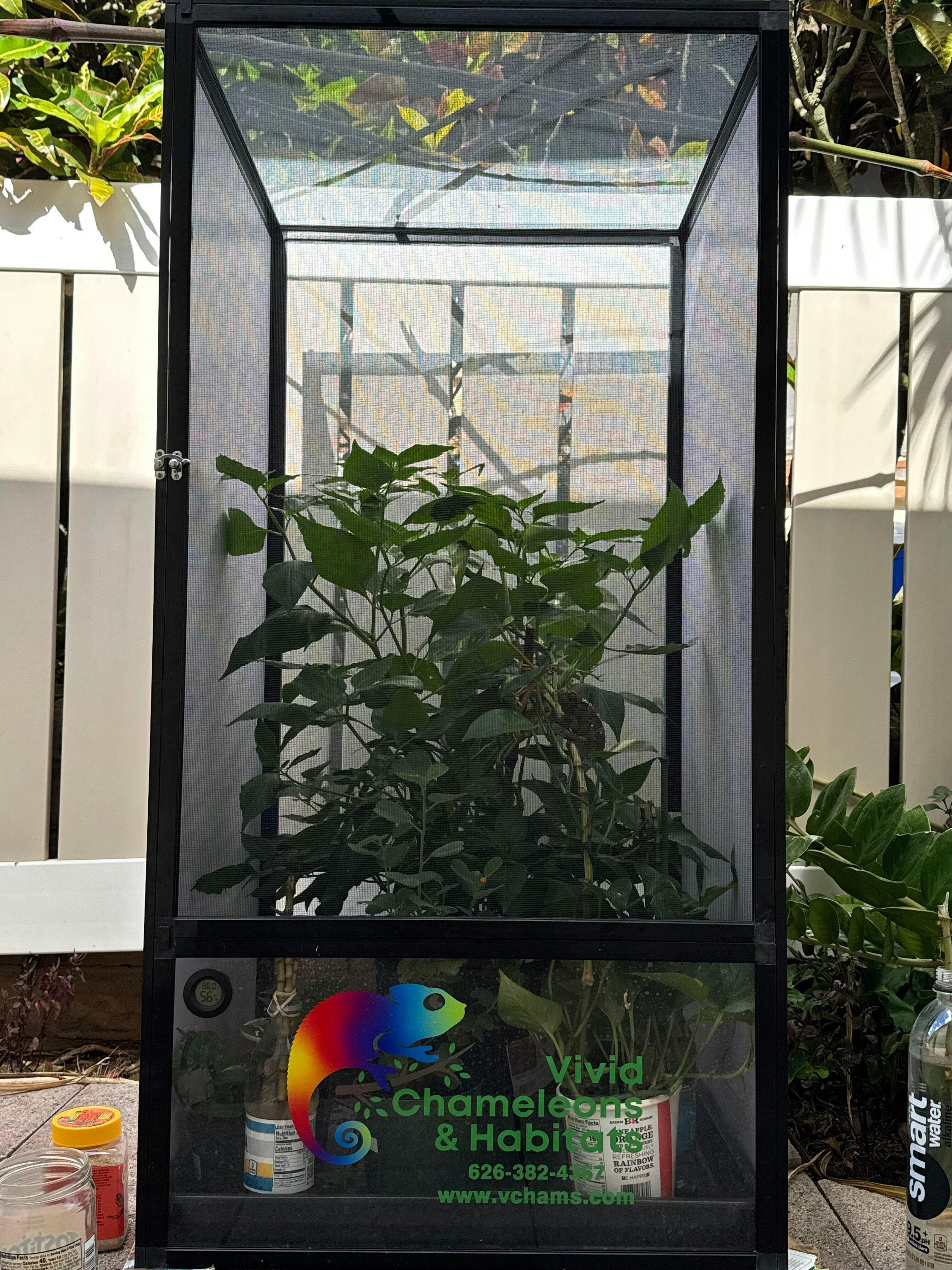 Designed by Vivid Chameleons & Habitats to exclusively customized to the needs of Chameleons. The front door, top, and back are made with duable, anti-rust aluminum mesh screen while left and right side are made of white PVC. The chameleon will have a lot of airflow for the right ventilation and humidity level.