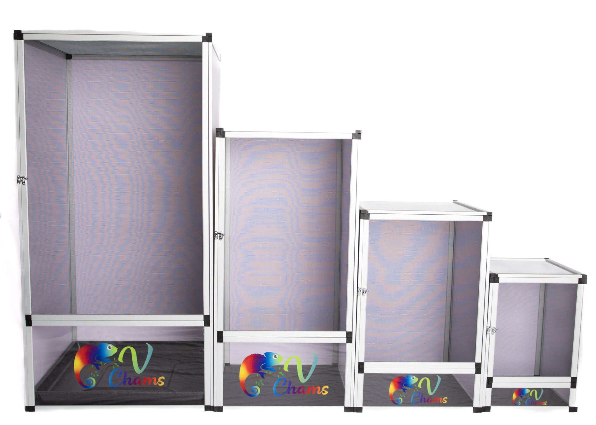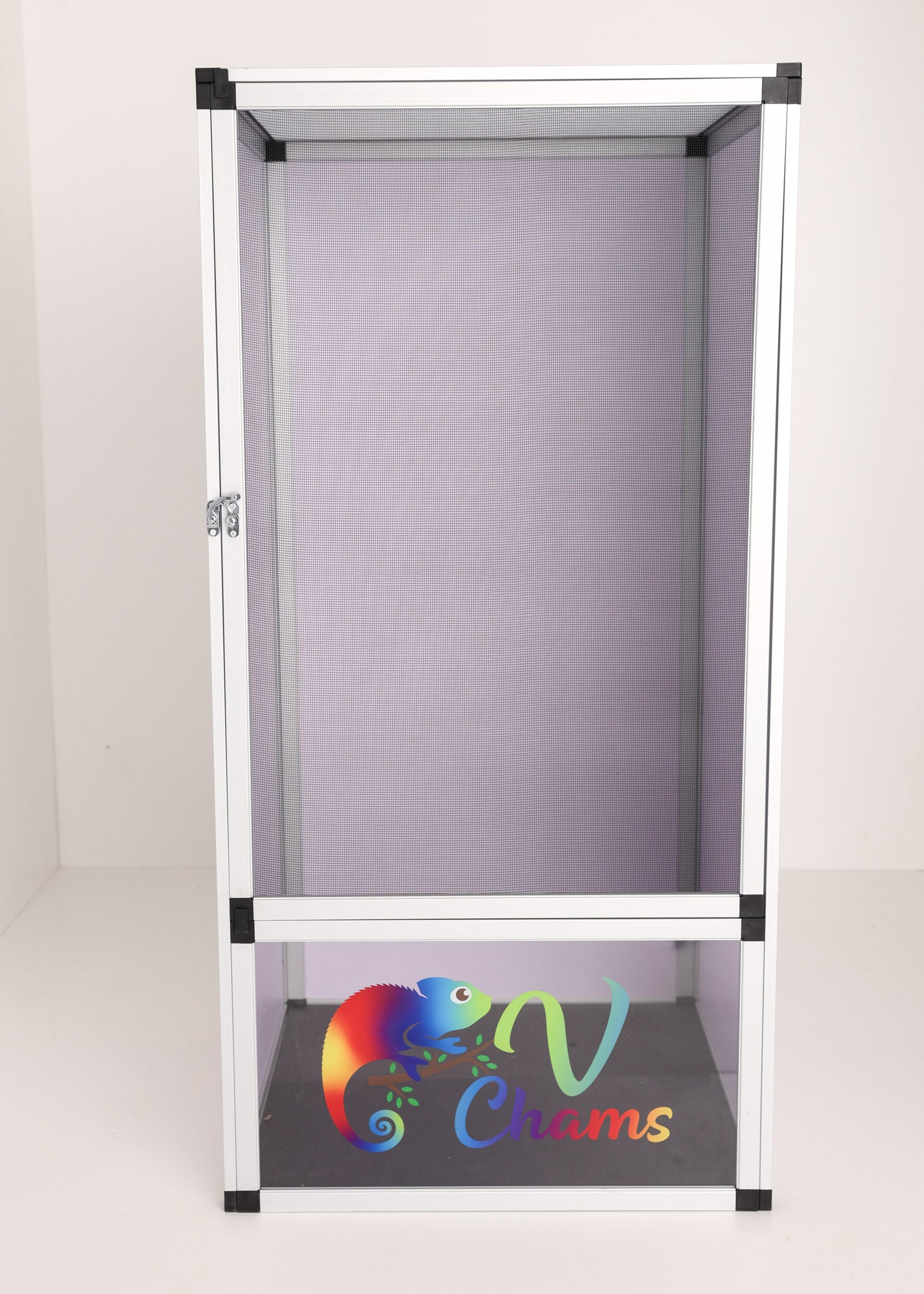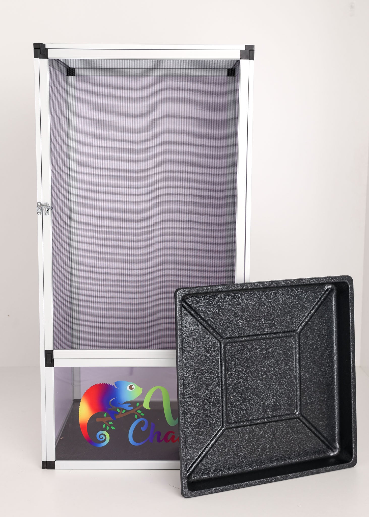 Designed by Vivid Chameleons & Habitats to exclusively customized to the needs of Chameleons. The front door, top, and back are made with duable, anti-rust aluminum mesh screen while left and right side are made of white PVC. The chameleon will have a lot of airflow for the right ventilation and humidity level.