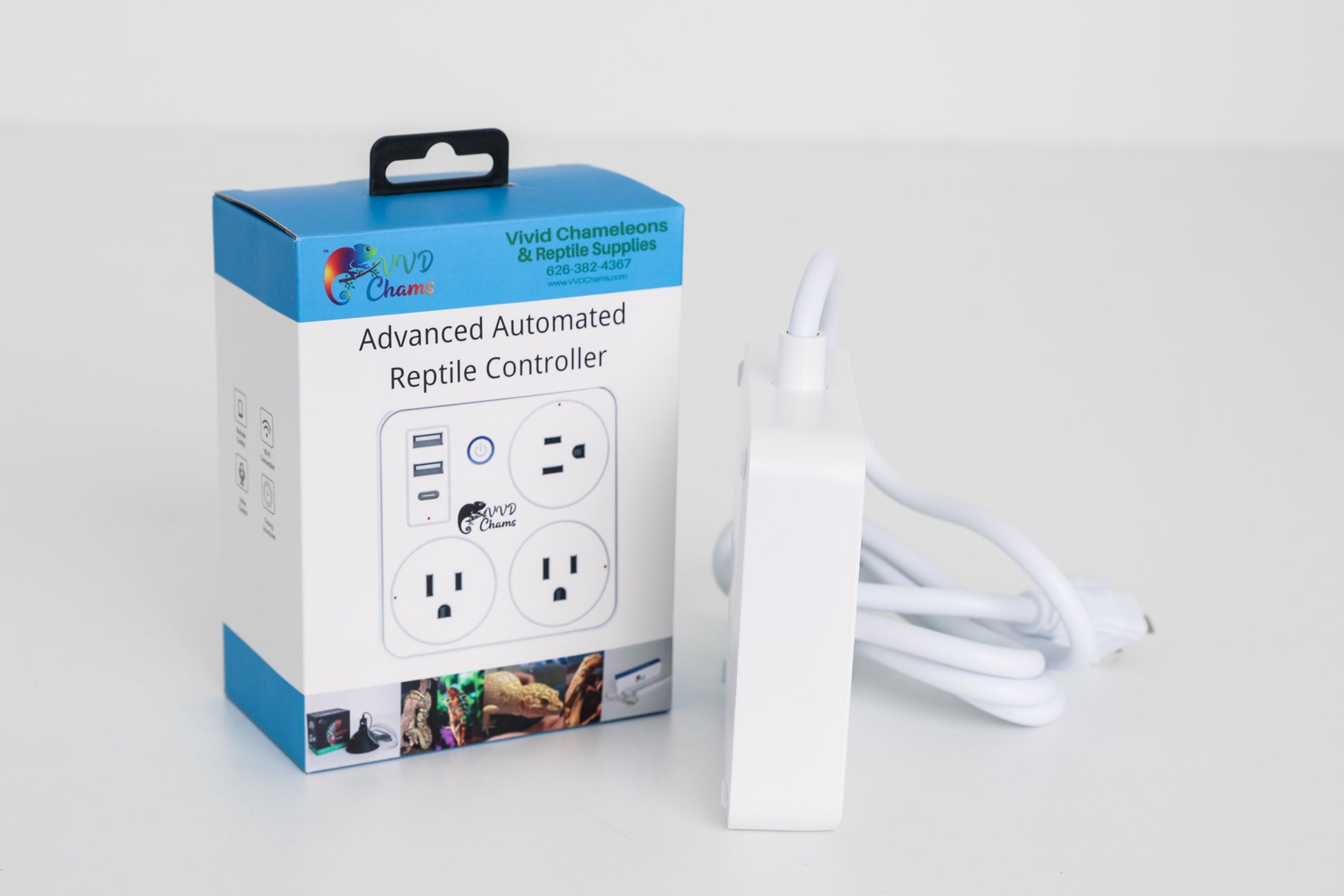 1 outlet for UVB, 1 outlet for heat lamp, 1 outlet for LED Plant light, and last USB outlet for misting system. We can setup up to 10 on/off timers for each outlet. All done using your phone app called “SmartLife”. Just download the QR code from the user manual then setup is a breeze with your phone.
